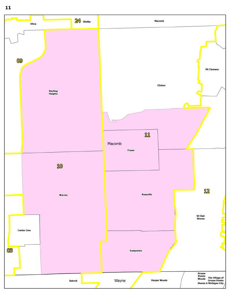 SD-11 now includes the communities of Eastpointe, Fraser, Roseville, Clinton Township (partial), Warren (partial), and Sterling Heights (partial).